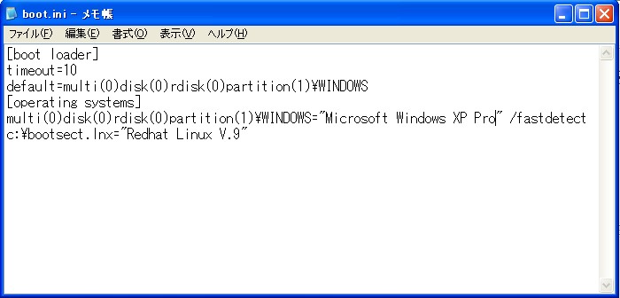 その最後の行に、C:\bootsect.lnx="Redhat Linux"と追記して、boot.iniを上書き保存する。