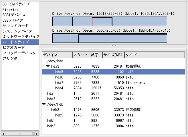 「hda5,6,7」が、LINUXに使用している、自動パーティション設定で割り振られた領域だ。 |